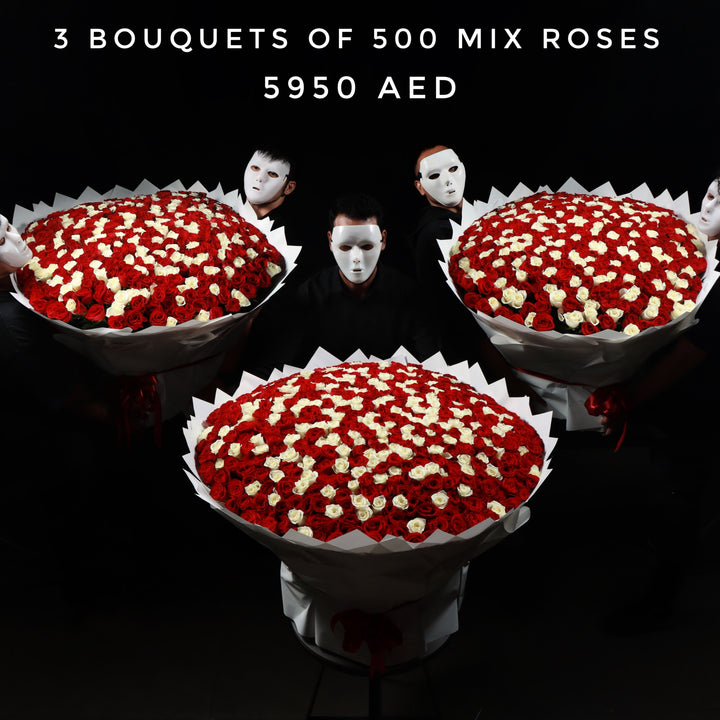 Command attention with this spectacular collection of three bouquets containing 500 mixed roses in an array white and red. This premium arrangement showcases diverse rose varieties, blending rich hues for maximum visual drama and sophistication. Ideal for grand events, corporate celebrations, or creating an unforgettable statement. Hand-arranged with expert care, each bouquet guarantees freshness and elegance. Same-day delivery available across Dubai.🌹💘