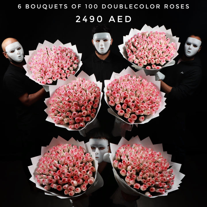 Make a grand statement with our 6 Bouquets of 100 Doublecolor Roses—600 premium stems showcasing striking two-tone petals in complementary color combinations. Ideal for large-scale events, corporate installations, or wholesale orders, this impressive collection delivers maximum visual impact and sophistication.🌹💘